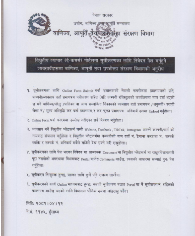 The Government of Nepal, through the Ministry of Industry, Commerce, and Supplies (“Ministry”), has issued a notification regarding businesses to submit listing forms on e-commerce portals. This announcement was published on 12 Shrawan 2082 (28 July 2025).